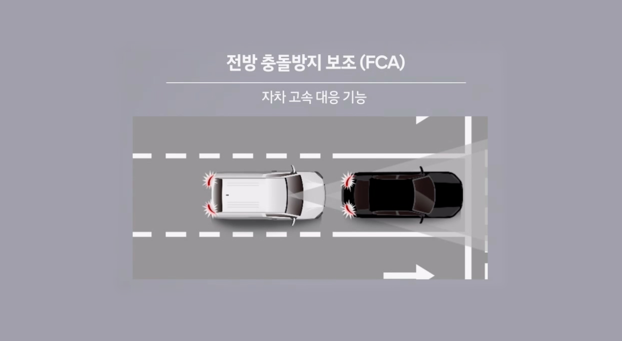 그 중 여러 기능들이 있는데, 예를 들면 '전방 충돌방지 보조(FCA)'는 앞 차와의 충돌을 예방하거나 충격을 완화해줍니다. 또한, '차로 유지 보조(LKA)'는 차가 차선을 이탈하지 않도록 도와주는 기능입니다.